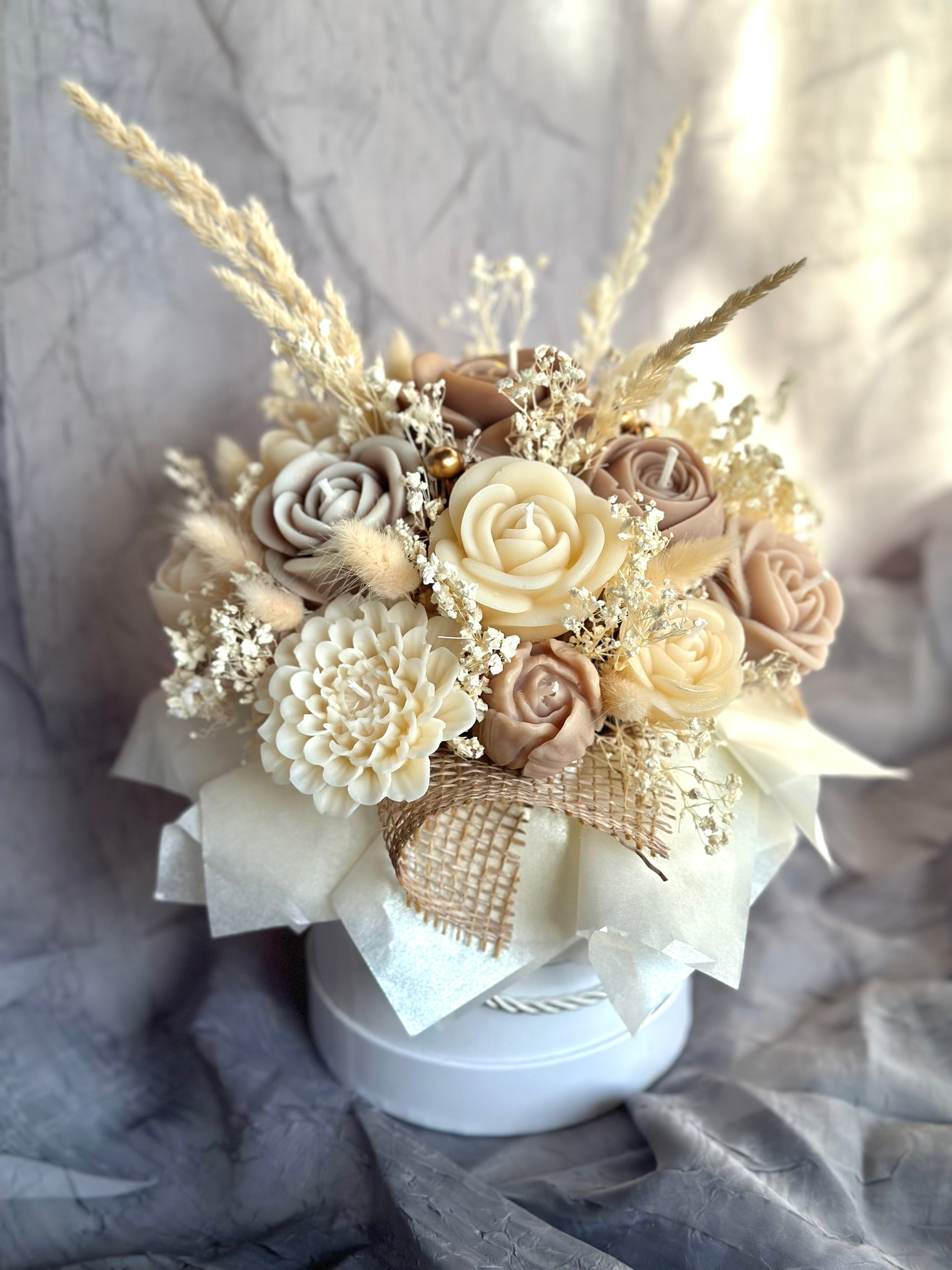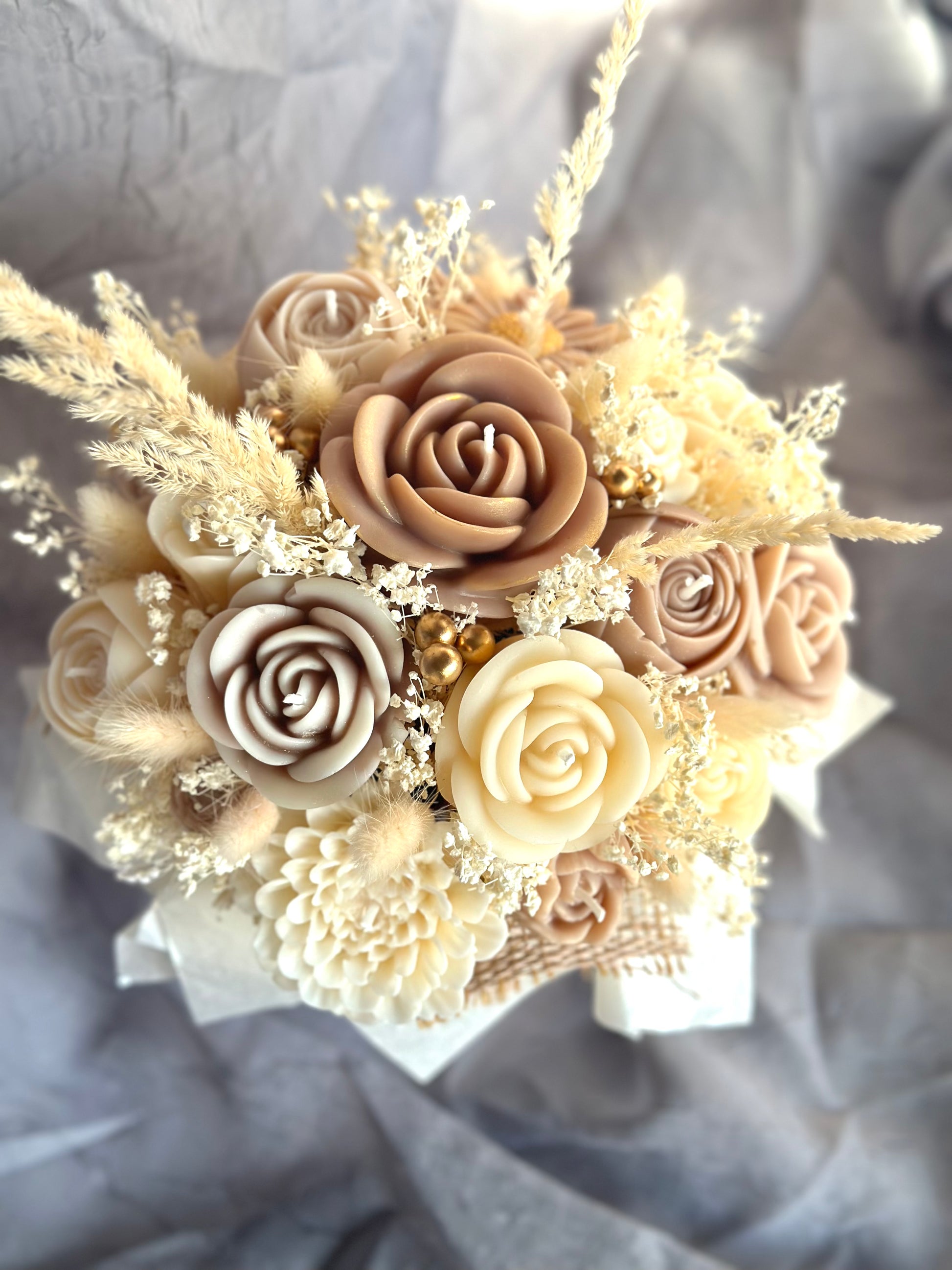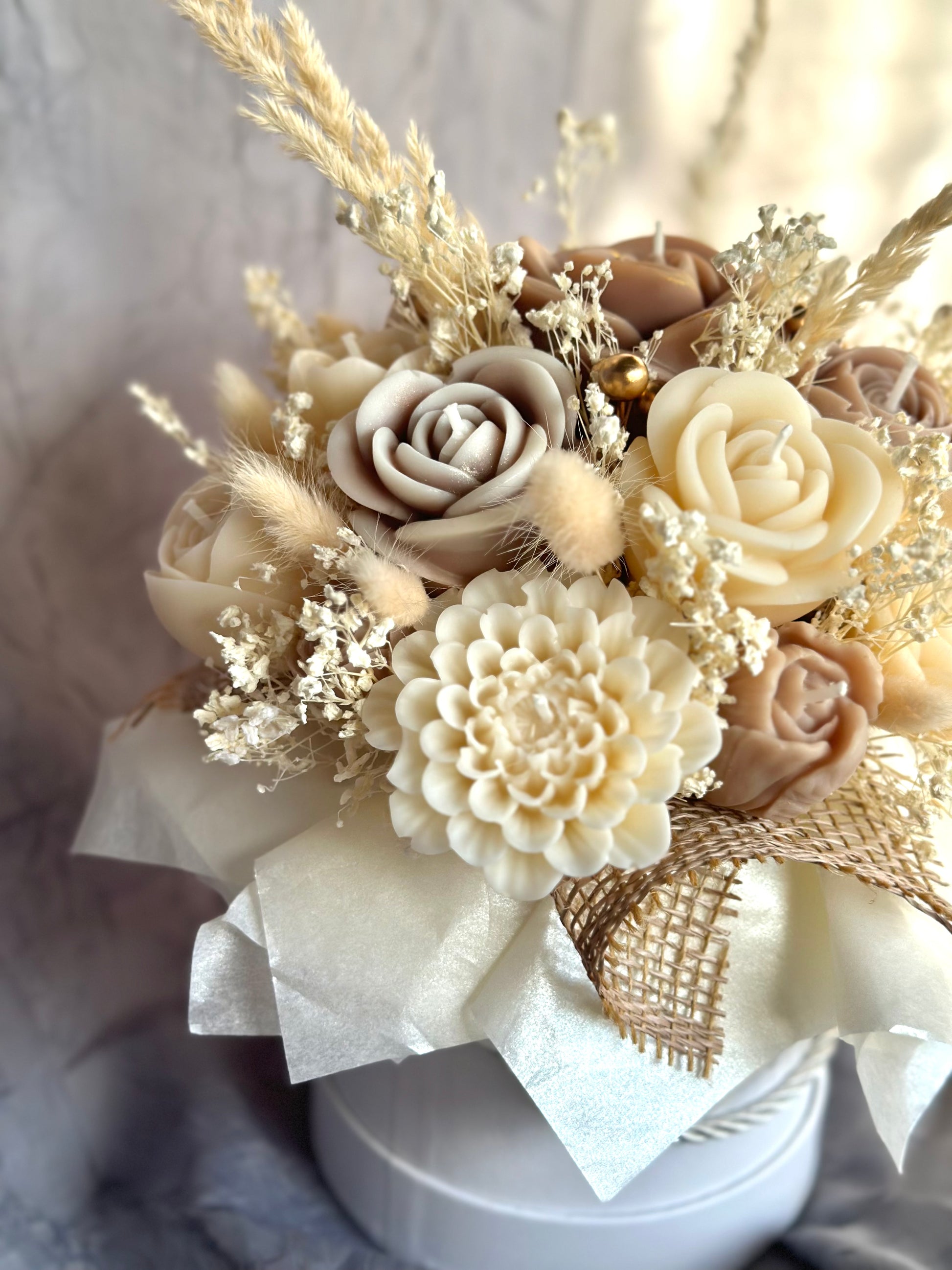 El Nude Luxe Bouquet combina tonos crema, blanco marfil y nude cálido en una composición que irradia elegancia extrema. Cada flor, trabajada con detalle y delicadeza, se mezcla con acentos secos y texturas suaves que crean un arreglo sofisticado, armonioso y perfecto para cualquier espacio moderno y acogedor.